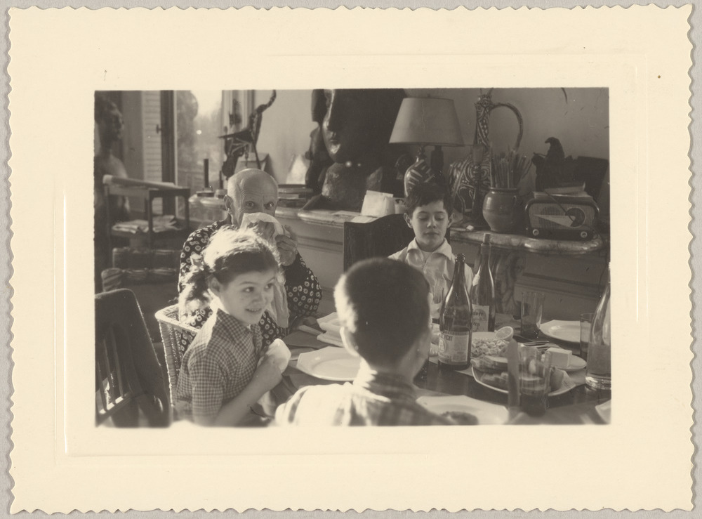 Pablo Picasso avec ses enfants, Claude et Paloma, et [Gérard Sassier] attablés…