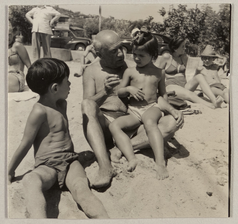 Pablo Picasso avec ses enfants Claude et Paloma à la plage de Golfe-Juan, été 1954