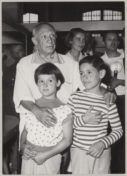 Pablo Picasso avec ses enfants Claude et Paloma lors de l'exposition annuelle des potiers au Nérolium de Vallauris, été 1957