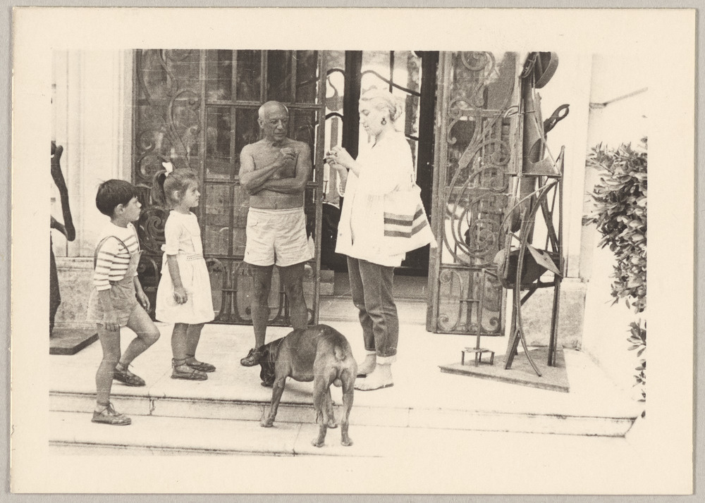 Pablo Picasso avec ses enfants, Maya, Claude et Paloma à l'entrée de La Californie, Cannes, [en été 1956]