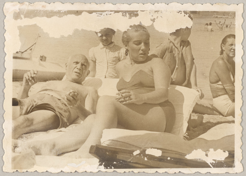 Pablo Picasso avec ses enfants, Maya, Claude et Paloma sur la plage de la Garoupe, Cap d'Antibes, en été 1956