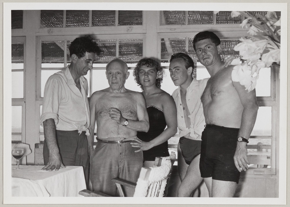 Pablo Picasso avec ses enfants Maya et Paul, un ami et Francisco Reina dit 'Minuni' au restaurant Nounou, Plage de Golfe-Juan, été 1954