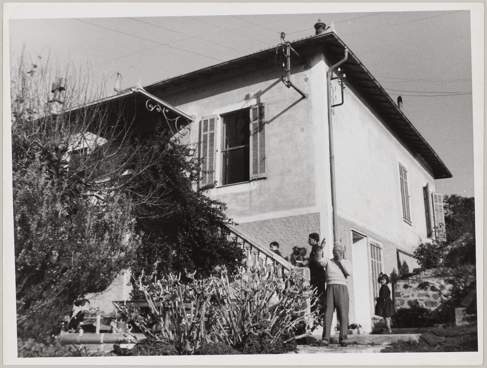 Pablo Picasso avec ses enfants, Paul, Claude et Paloma, rentrant à la Galloise, Vallauris, le 23 décembre 1953