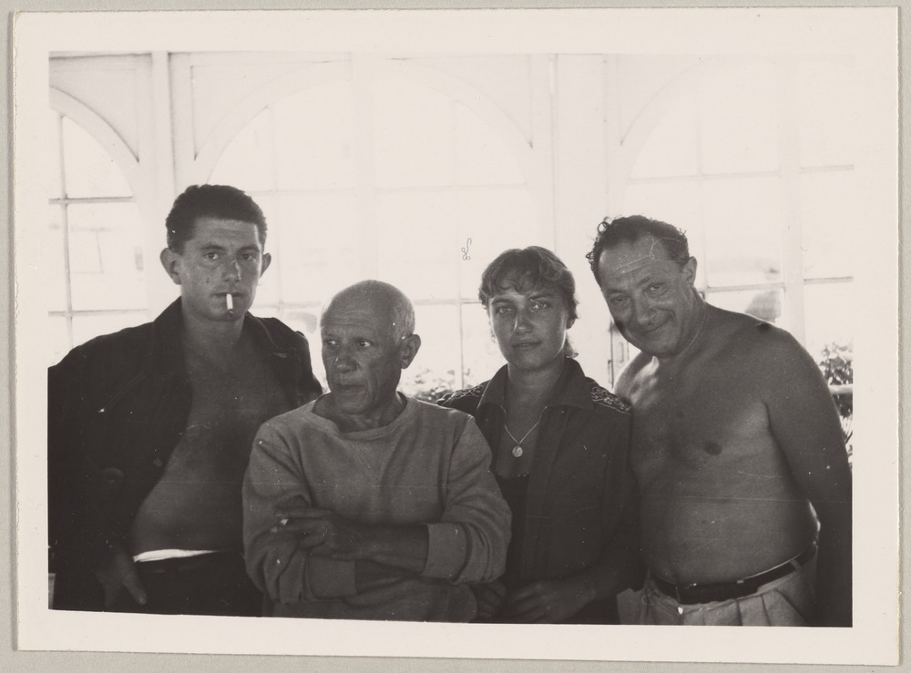 Pablo Picasso avec ses enfants, Paul et Maya, avec un ami au restaurant Nounou, plage de Golfe-Juan, été 1954