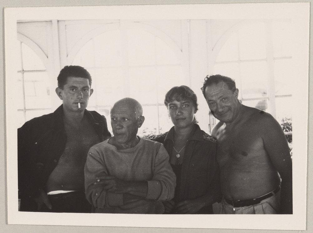 Pablo Picasso avec ses enfants, Paul et Maya, et un ami au restaurant Nounou, plage de Golfe-Juan, été 1954