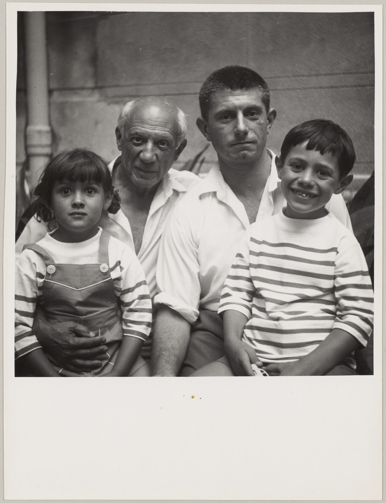 Pablo Picasso avec ses enfants, Paul, Paloma et Claude dans la cour de l'hôtel particulier des Lazerme, Perpignan, en août 1954