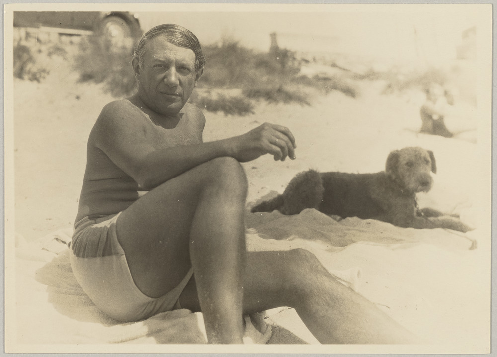 Pablo Picasso avec son chien Elfe sur la plage de Juan-les-Pins, en août 1931
