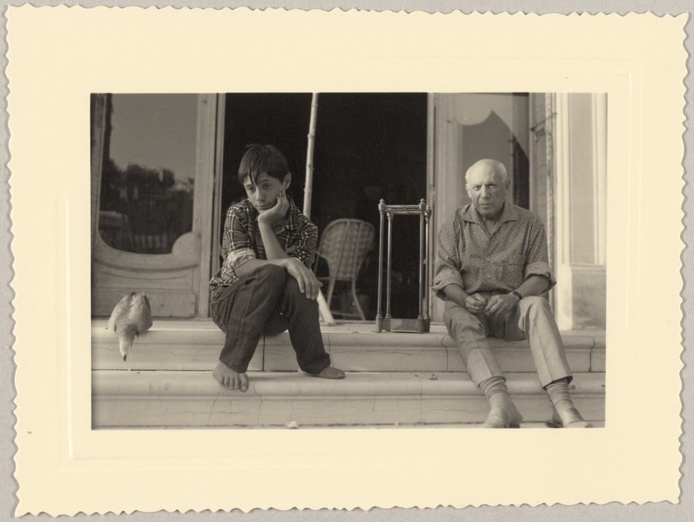 Pablo Picasso avec son fils Claude assis sur les marches, le perroquet à côté sur le perron de La Californie, Cannes, en [1960]