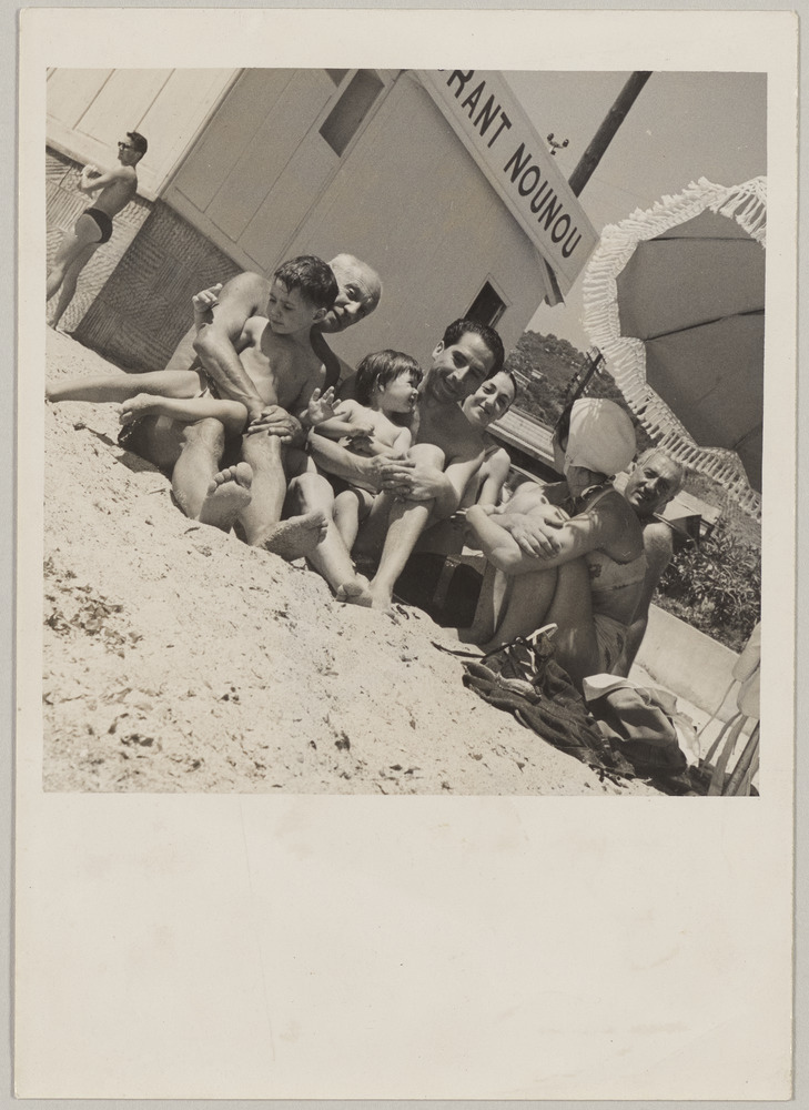 Pablo Picasso avec son fils Claude dans les bras, Françoise Gilot, Manuel Ángeles Ortiz, Paloma et des amis sur la plage de Golfe-Juan, en [1952]