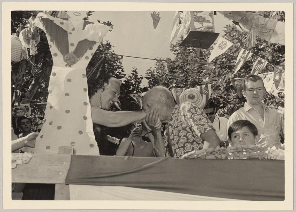 Pablo Picasso avec son fils Claude et Yolande [de Bodner] lors d'une fête à Vallauris, en septembre 1954