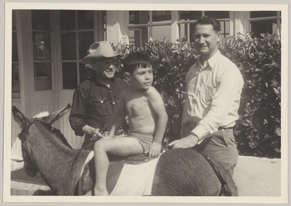Pablo Picasso avec son fils, Claude sur un âne, et Channing Peake devant le restaurant Tetou, Golfe-Juan, en 1953