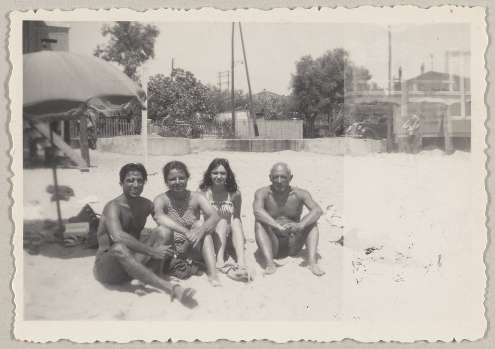 Pablo Picasso avec son neveu Javier Vilató Ruiz, Matsi Hatzilazarou et Florence Loeb sur la plage de Golfe-Juan, en 1948