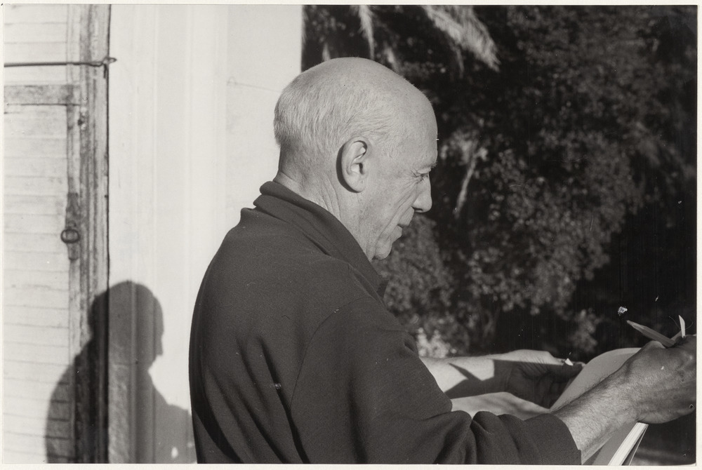 Pablo Picasso avec un bloc-note et un crayon sur le perron de La Californie, Cannes