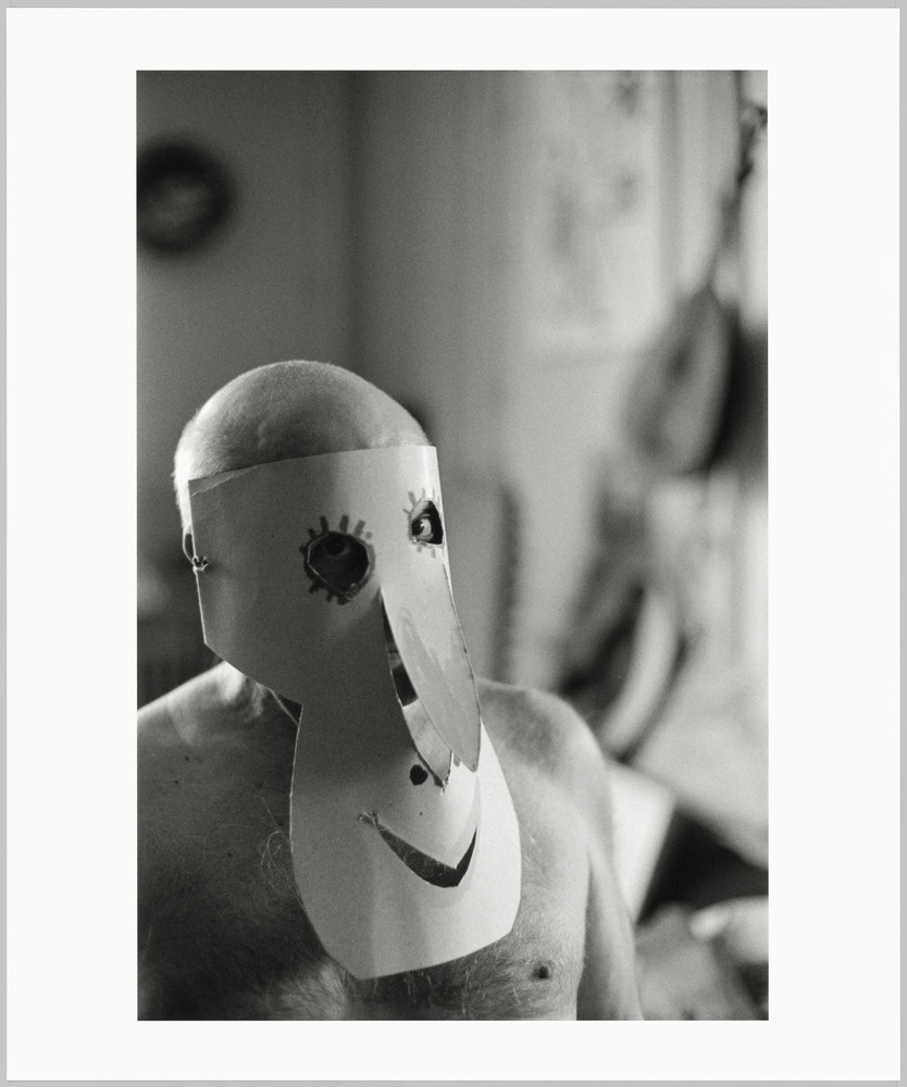 Pablo Picasso avec un masque dans l'atelier de La Californie, Cannes, en été…