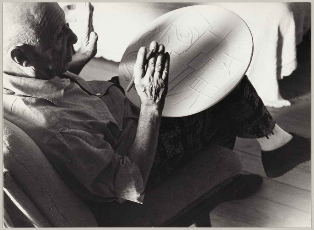 Pablo Picasso avec un plat en céramique sur les genoux, à La Californie, Cannes