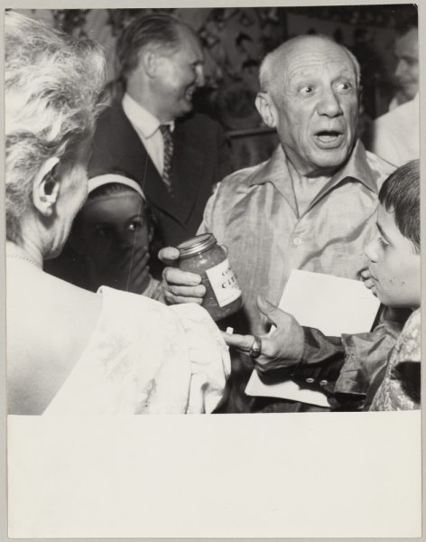 Pablo Picasso avec un pot de confiture et ses enfants, Claude et Paloma, lors d'une exposition, Vallauris, en juillet 1958