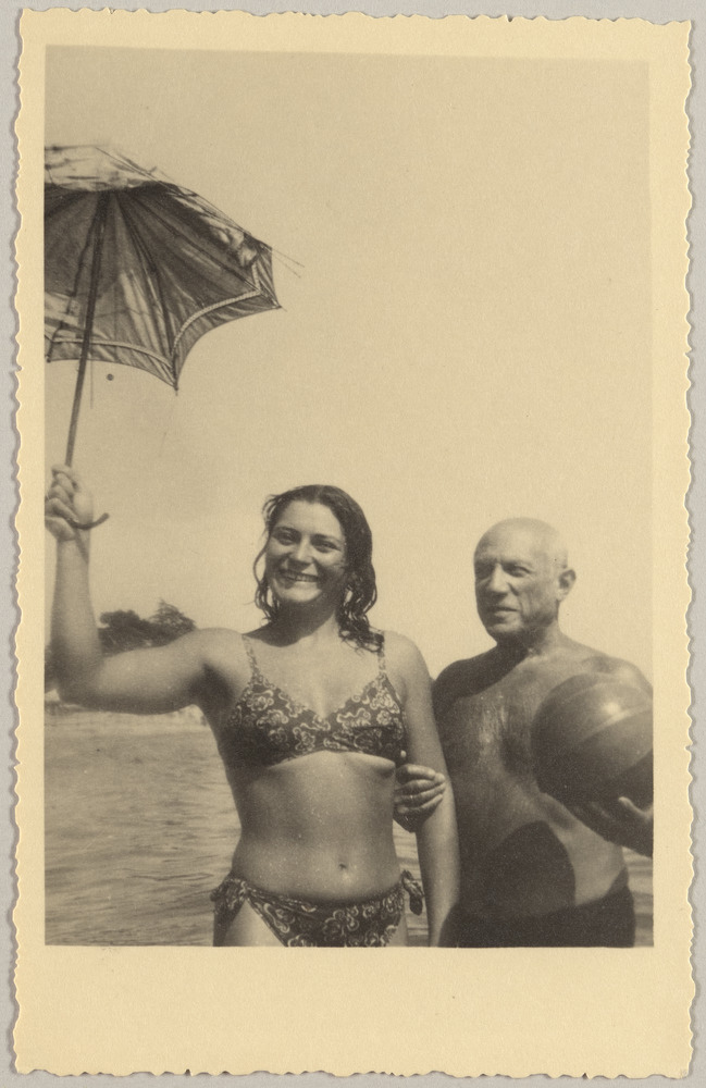 Pablo Picasso avec une amie sur la plage de Golfe-Juan, en [1947-49]