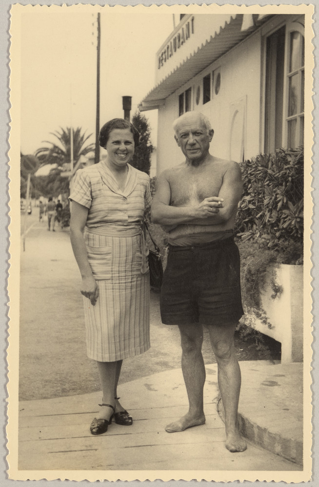 Pablo Picasso avec une femme non identifiée devant le restaurant Nounou, plage de Golfe-Juan, en août 1951