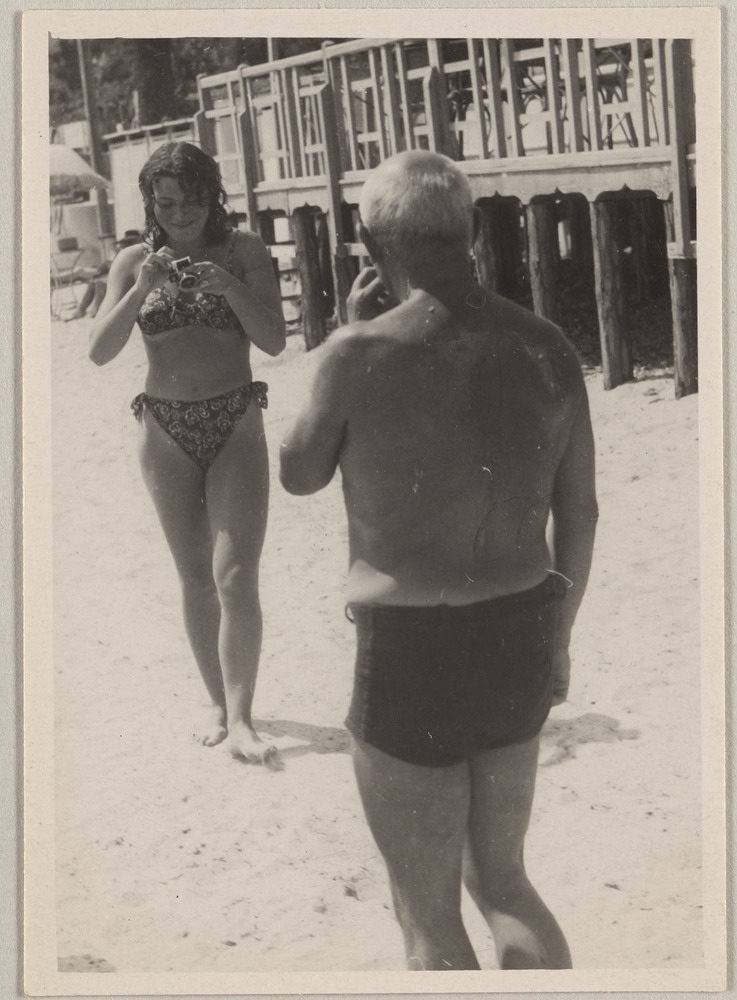 Pablo Picasso avec une femme non identifiée munie d'un appareil photographique, sur la plage de Golfe-Juan, en [1947-49]