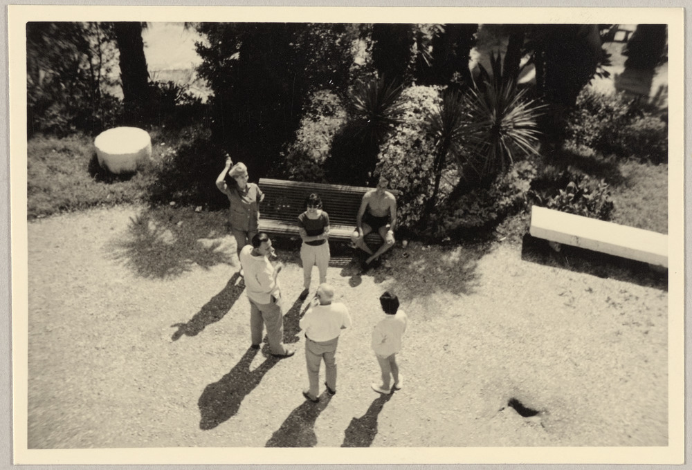 Pablo Picasso, [Catherine Hutin], deux hommes, deux femmes dans le jardin, vue depuis le 1er étage de la Californie, Cannes