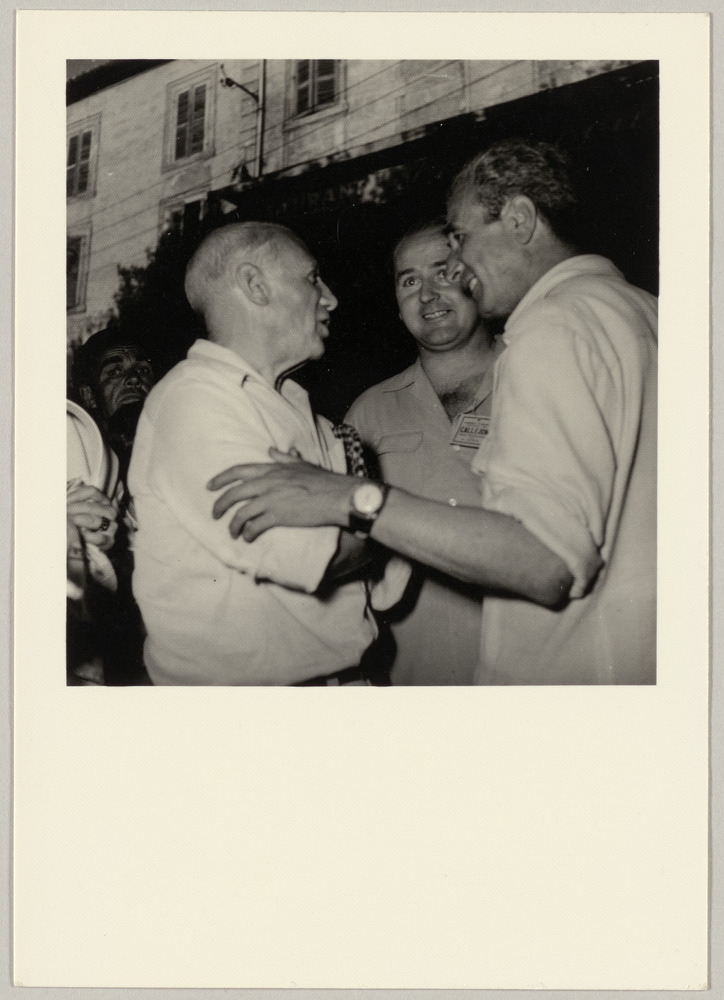 Pablo Picasso, [César Giron] et un ami dans les rues de [Vallauris], en 1955