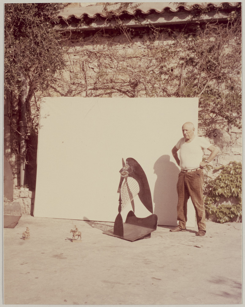 Pablo Picasso à coté de la maquette de la sculpture "Tête" du Chicago Civic Center et deux statuettes à l'extérieur, Notre-Dame de Vie, Mougins, en août 1965