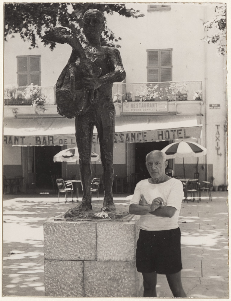 Pablo Picasso à côté de la sculpture "L'Homme au mouton" sur la place Paul Isnard, Vallauris, début des années 1950