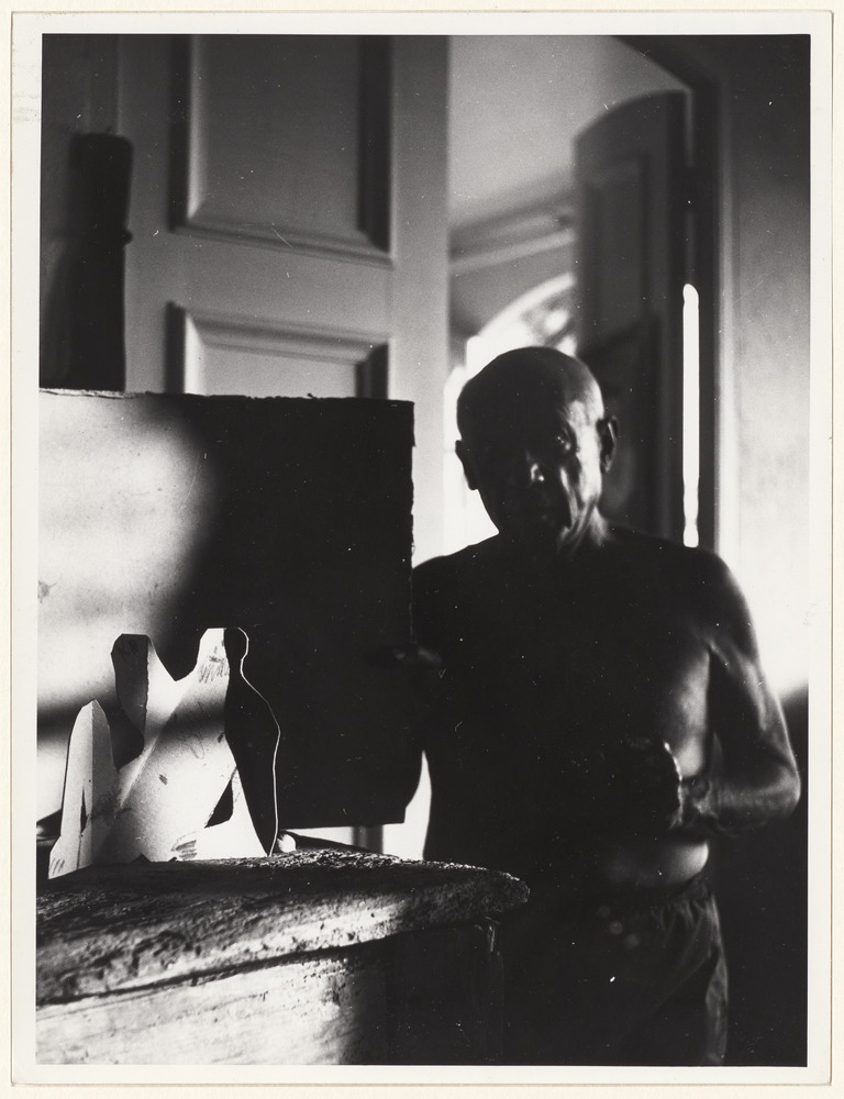 Pablo Picasso à côté sculpture à la mine de plomb et carton découpé et plié "Homme assis accoudé" du "Le déjeuner sur l'herbe", le 28 août 1962