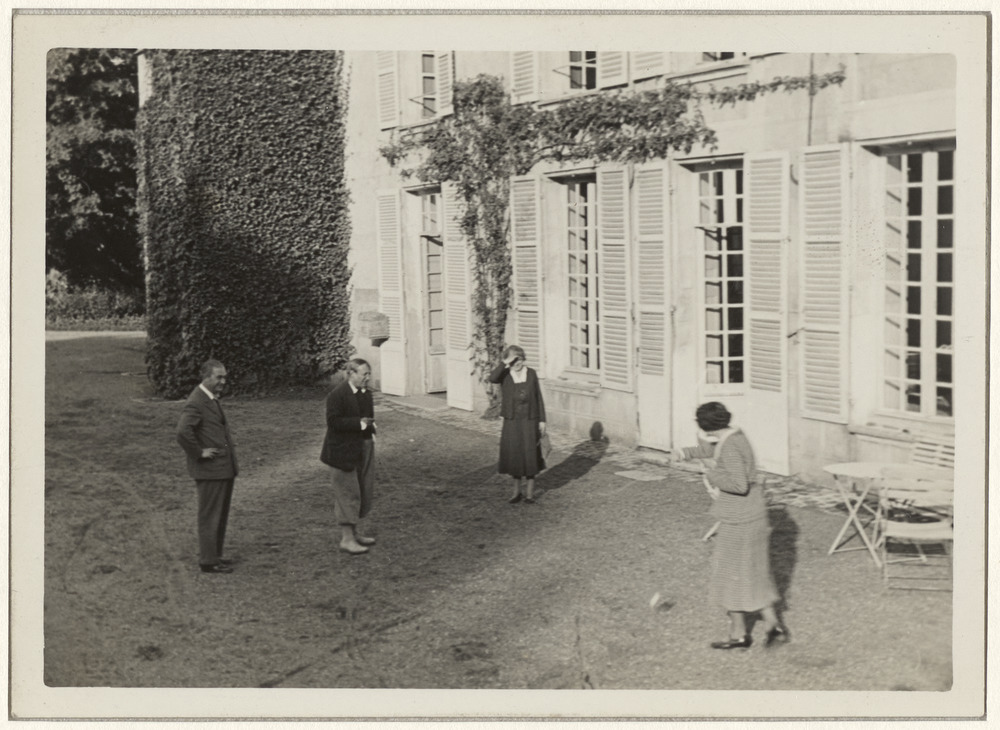 Pablo Picasso, Daniel-Henry Kahnweiler, Jeanne Godon et Berthe Lascaux sur la terrasse de Boisgeloup, Gisors, début des années 1930