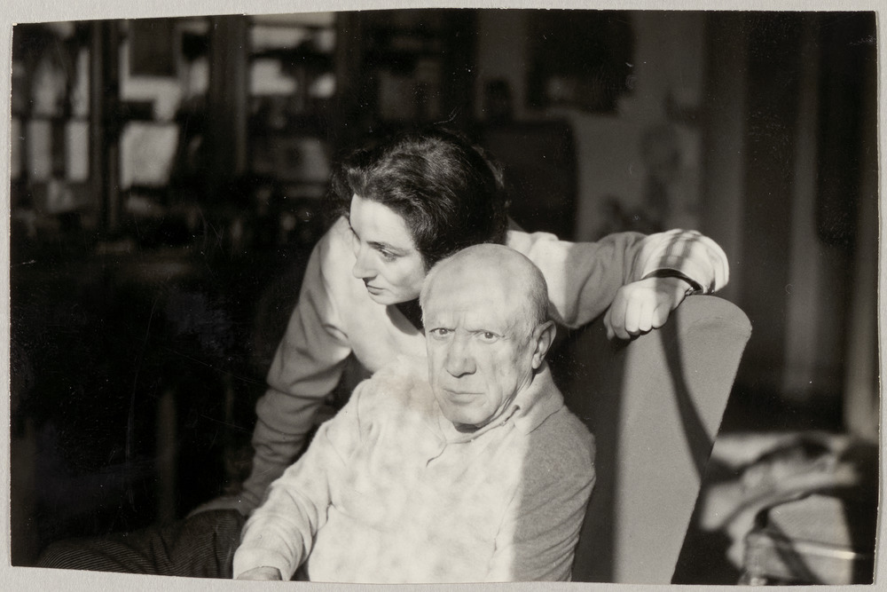 Pablo Picasso dans un fauteuil et Jacqueline Roque sur l'accoudoir à La Californie, Cannes