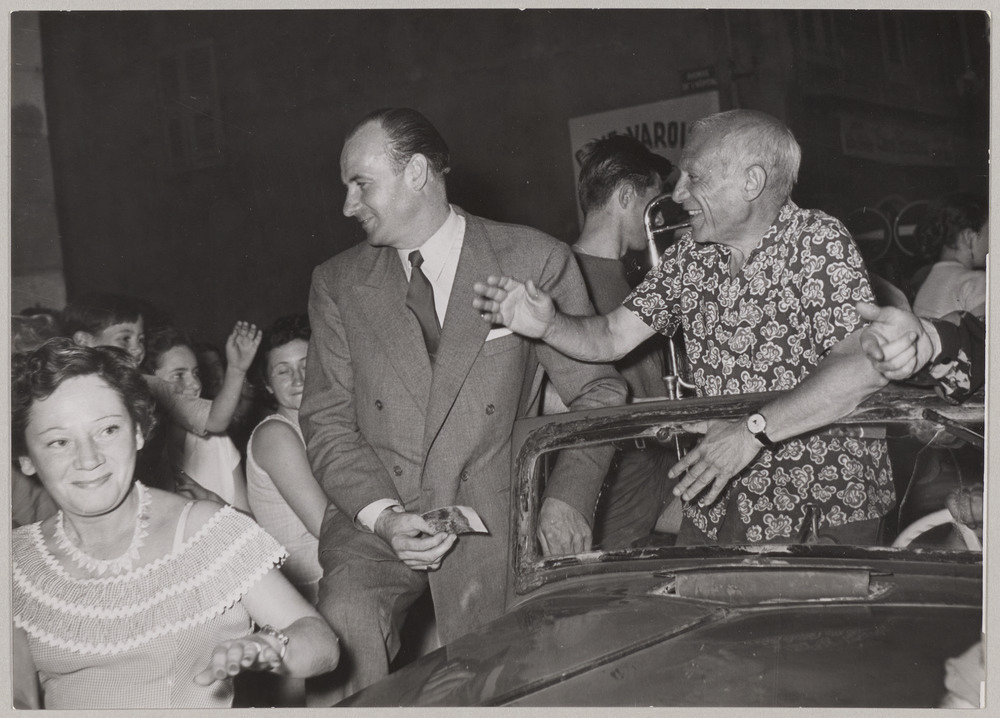 Pablo Picasso dans une voiture avec des amis lors du défilé de Vallauris, le 30 juillet 1954
