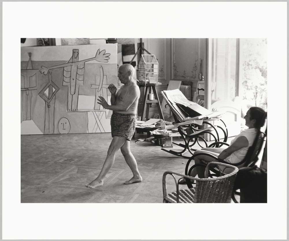 Pablo Picasso dansant devant "Baigneurs à la Garoupe" sous le regard de Jacqueline Roque, dans l'atelier de La Californie, Cannes, en juillet 1957