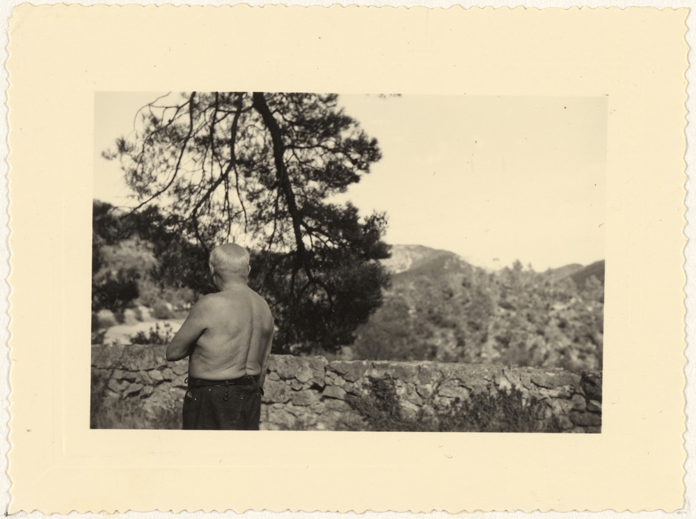 Pablo Picasso de dos dans le jardin du Château de Vauvenargues, années 1960