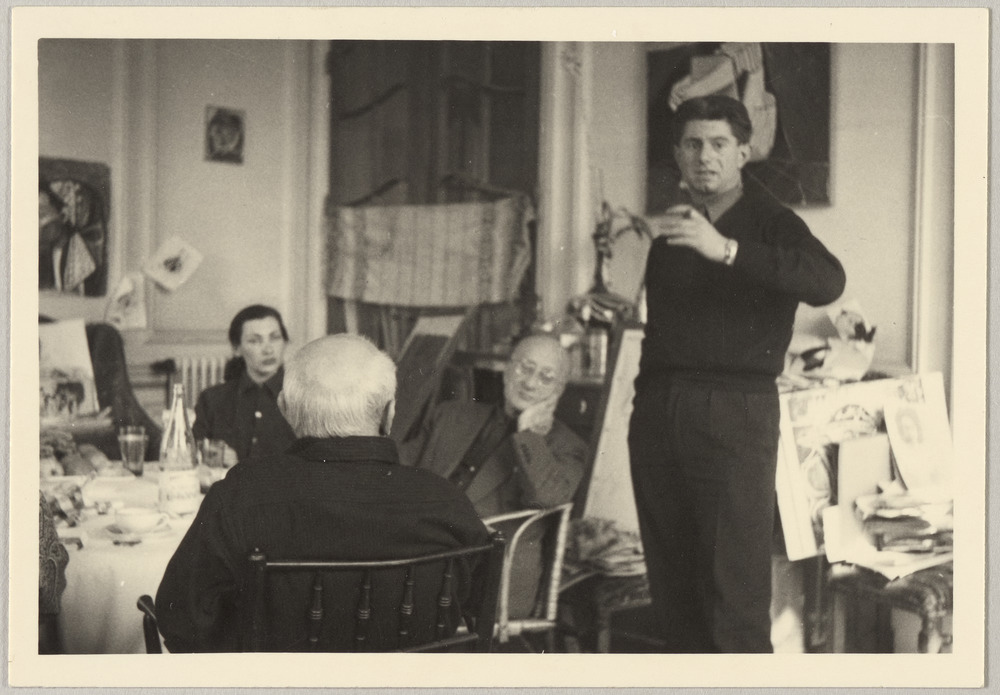 Pablo Picasso de dos, Jaime Sabartès et Christine Picasso attablés, Paul Picasso debout, dans l'atelier de La Californie, Cannes
