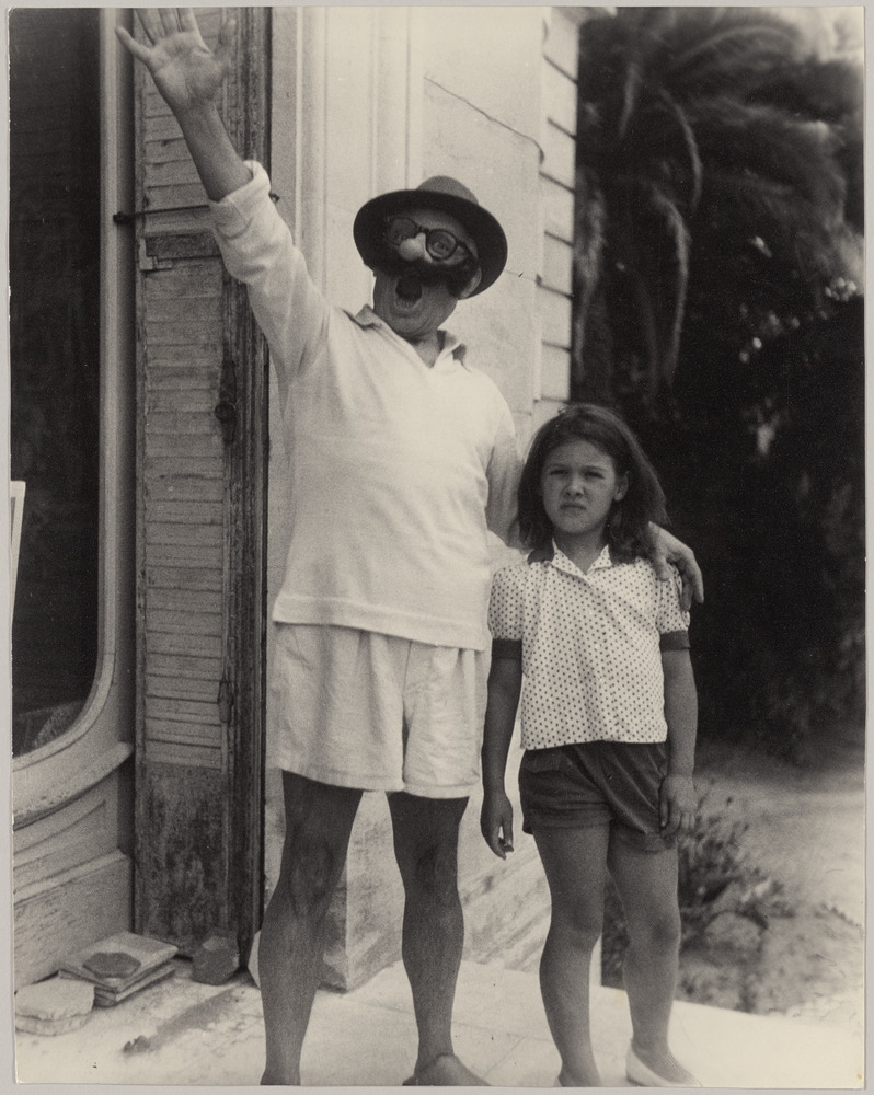 Pablo Picasso déguisé avec sa fille Paloma sur le perron de La Californie, Cannes, en 1957