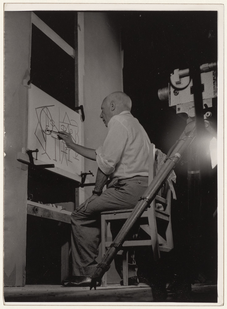 Pablo Picasso dessinant "Femme et bouffon" sur le tournage du "Mystère Picasso" de Henri-Georges Clouzot, studio de La Victorine, Nice, en 1955