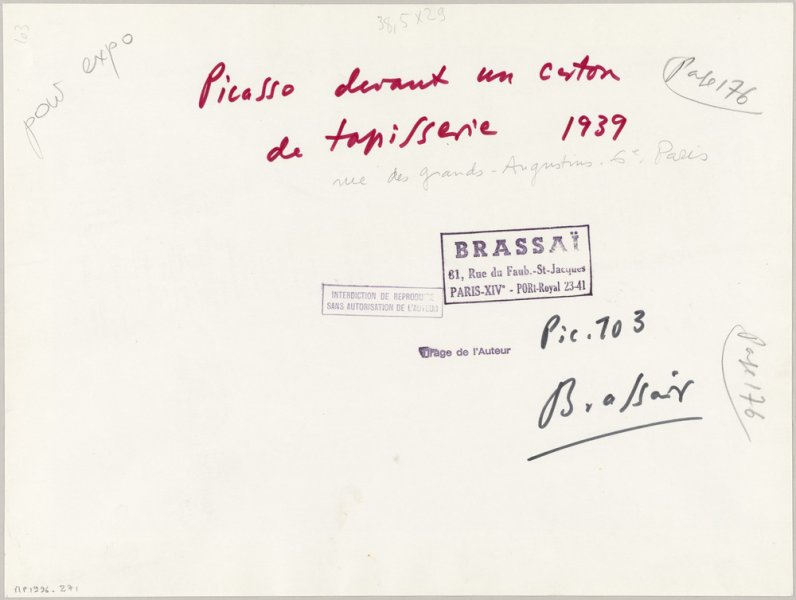 Annotation manuscrite de l'auteur au dos, centrée : "Picasso devant un carton de tapisserie 1939. Pic.103 [signé] Brassaï"