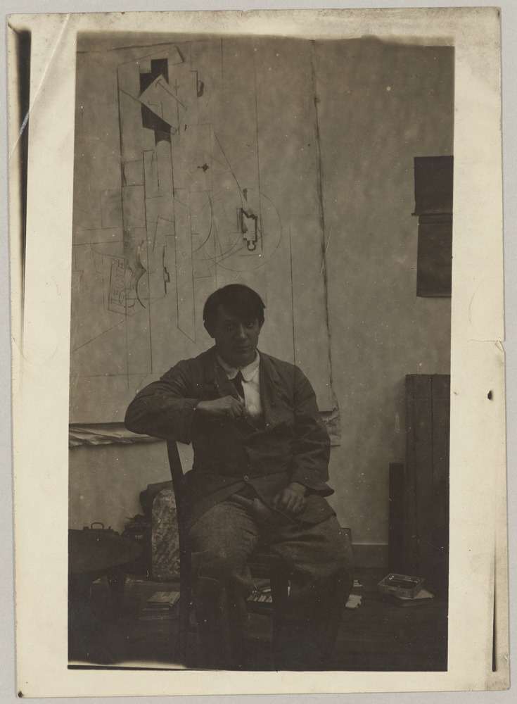 Pablo Picasso devant la peinture "Construction au joueur de guitare" dans l'atelier du Boulevard Raspail, Paris, en été 1913