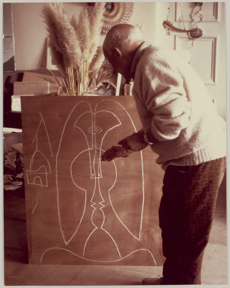 Pablo Picasso devant un dessin préparatoire pour la sculpture "Tête" du Chicago…