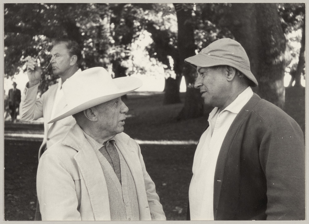 Pablo Picasso discutant avec Jacques Couëlle dans le jardin de Castellaras-le-Vieux, Mouans-Sartoux, en 1960
