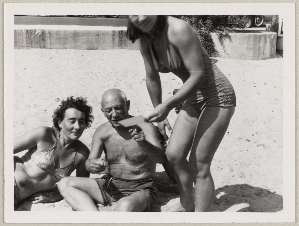 Pablo Picasso, Dominique Eluard et Françoise Gilot sur la plage de Golfe-Juan, circa 1949-51