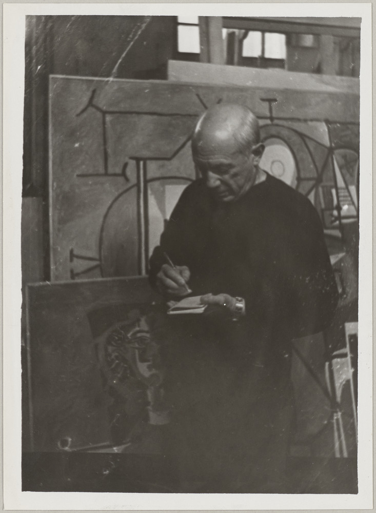 Pablo Picasso écrivant sur un carnet, devant l'huile sur toile "La cuisine", dans l'atelier des Grands-Augustins, Paris, en [1948]