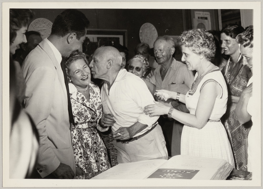 Pablo Picasso embrassant Gilberte Duclaud aux côtés de Suzanne Ramié et Serge Chauby lors du vernissage de l'exposition "Pâtes blanches" à la galerie 65, Cannes, le 9 août 1957