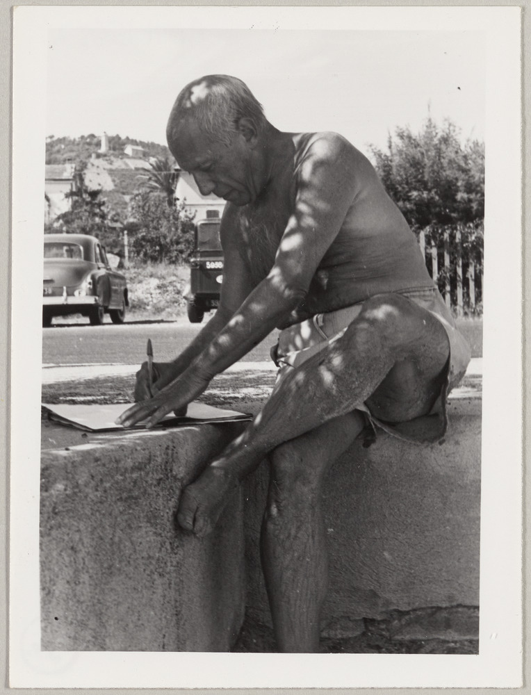 Pablo Picasso en train de dessiner sur un muret, plage de Golfe-Juan, en [1950]
