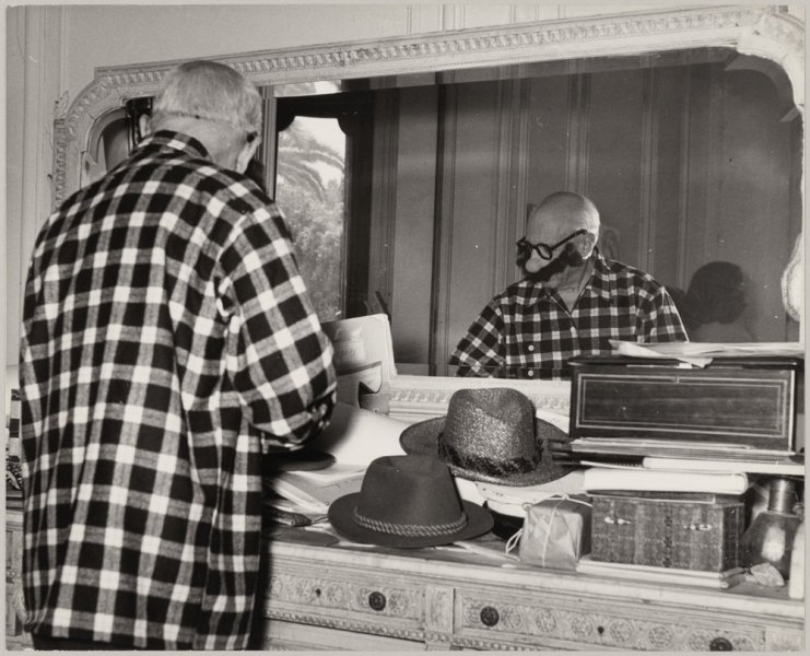 Pablo Picasso en train de se déguiser avec lunettes, faux nez et barbe postiche devant le miroir du buffet de l'atelier de La Californie, Cannes, en 1960-61