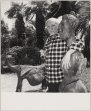 Pablo Picasso enlaçant la sculpture "La Femme en robe longue" dans le jardin de La Californie, Cannes, en 1960-61