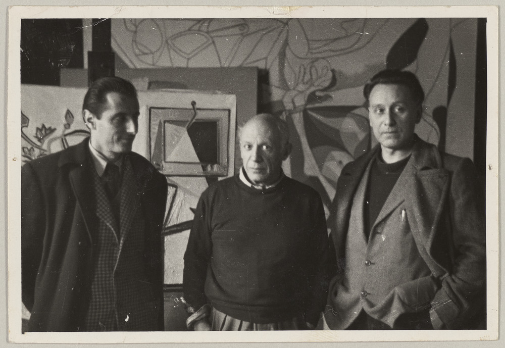 Pablo Picasso entouré de deux hommes, devant les toiles "Hibou et flèche" et "Le Charnier", dans l'atelier des Grands-Augustins, Paris, en [1948]
