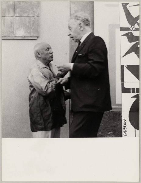 Pablo Picasso et Arthur Rubinstein lors d'une exposition, Vallauris, en juillet 1958