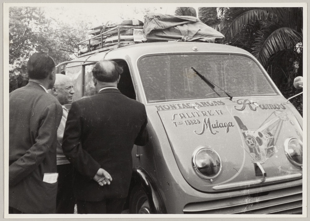 Pablo Picasso et deux membres "El grupo Malagueno" de dos à côté de leur camionette à La Californie, Cannes, en [novembre] 1957