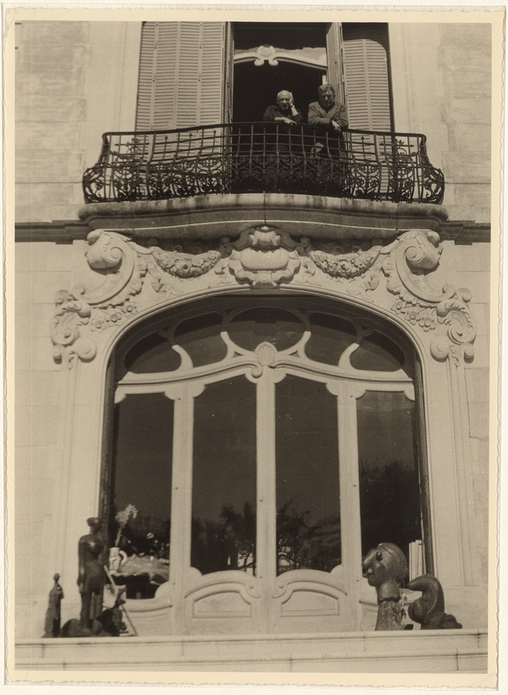 Picasso et Pignon accoudés à la balustrade, balcon du premier étage